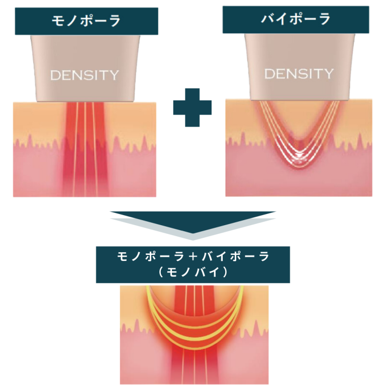 持続的効果を発揮する「モノポーラRF」と即時的効果を発揮する「バイポーラRF」を同時に照射することができる「モノバイ技術」がDENSITY最大の特徴です。